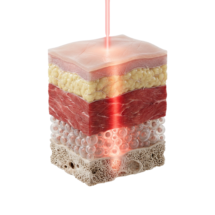 Red (660nm) and near-infrared (850nm) light penetrate below the skin to reach muscles, joints, tendons, and connective tissue.