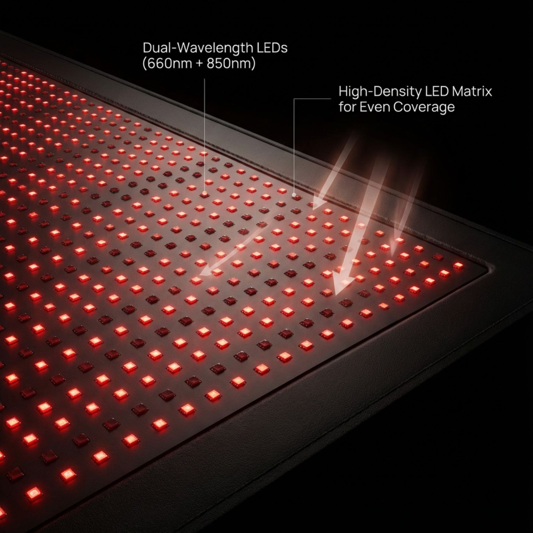 Clinically studied red + near-infrared wavelengths (660nm + 850nm)